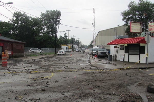 Mud slicks, building debris and upturned asphalt smothered the street after torrential rain flooded the area overnight. On East Haines, the muddy waters carved out a gaping hole in the side of a small church.